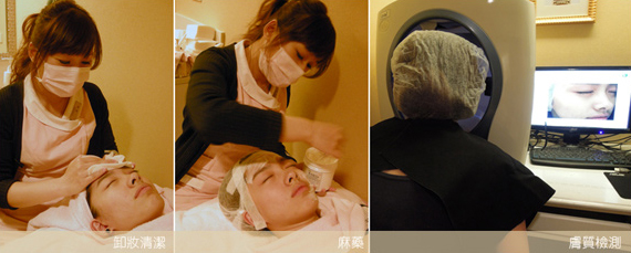 卸妝清潔→麻藥→複合式雞尾酒雷射治療→鎮定舒緩→術後保養品防護