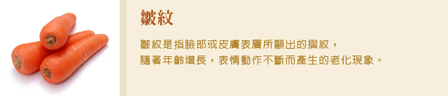 - 老化皺紋:隨著年齡增長,皮膚的彈性纖維及膠原蛋白漸少而導致。