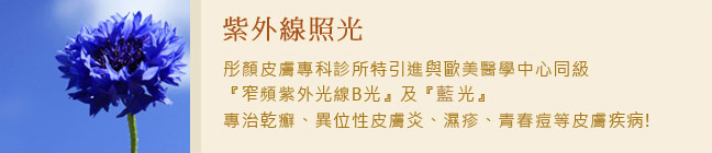 彤顏皮膚科診所『窄頻紫外光線B光』及『藍光』照光治療,可改善皮膚不適情況。在專業儀器輔助下,調節肌膚免疫反應,降低長期吃藥困擾。
