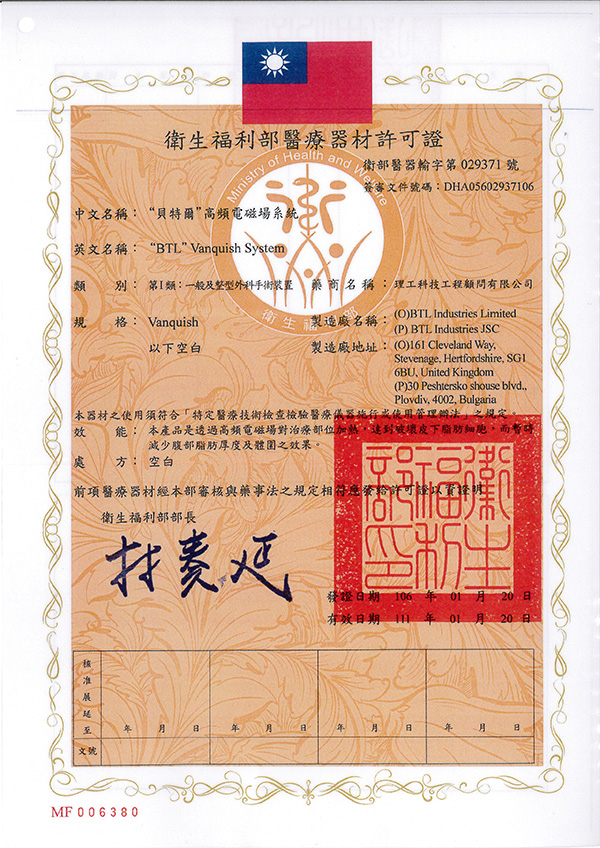 “BTL ”Vanquish System “貝特爾” 高頻電磁場系統 衛部醫器輸字第 029371 號 俗稱隔空減脂,體外減脂,貴妃溶脂