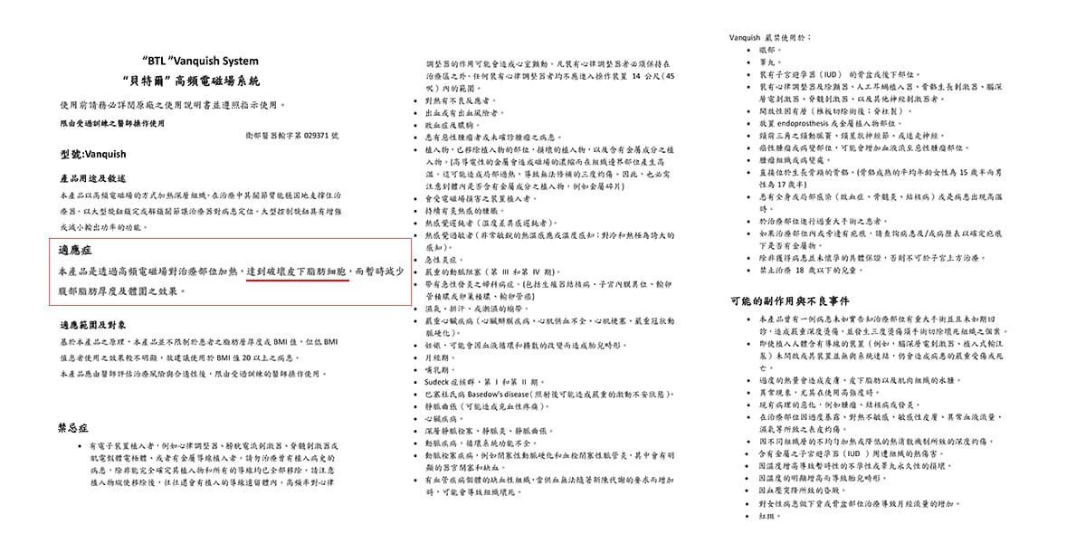 本宣傳名稱與仿單不同(部分為手術方法介紹,或口語化供民眾理解,Vanquish坊間俗稱隔空減脂),僅供參考;正式療程/儀器名稱、效果等,均以醫師親自說明為準。