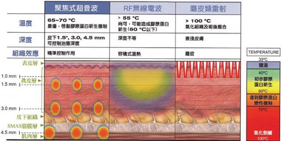 美國音波拉提-聚焦能量治療深度為3.0~4.5mm,除了作用到纖維中隔之外,還可以作用到更深部的筋膜層(SMAS),纖維肌層正是手術拉皮時會治療到的重要拉提關鍵;音波拉提每單一能量點(TCP)在皮下作用的溫度可到達65℃~70℃,能刺激膠原蛋白增生。